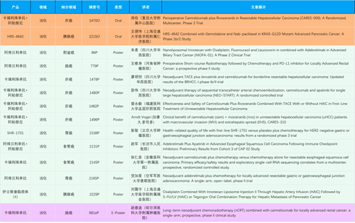 在消化系统肿瘤领域,尊龙凯时人生就是博产品相关研究共入选2项口头报告、11项壁报和1项电子壁报,共14项研究。除卡瑞利珠单抗和阿帕替尼外,还有4篇阿得贝利单抗治疗消化系统肿瘤研究入选。HRS-4642、瑞拉芙普-α注射液(SHR-1701)等在研创新产品也有相应研究亮相。另有1项伊立替康脂质体(II)用于胰腺癌治疗的研究入选壁报。