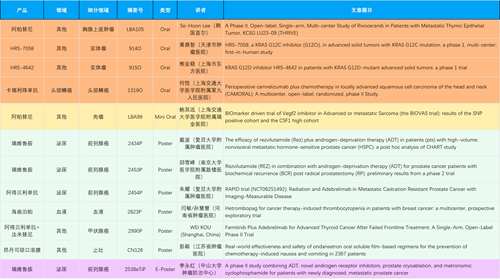 在胸腺上皮肿瘤、头颈鳞癌、肉瘤、前列腺癌、甲状腺癌等其他多个疾病领域,卡瑞利珠单抗、阿帕替尼、瑞维鲁胺、阿得贝利单抗、法米替尼、HRS-7058、HRS-4642等抗肿瘤创新药相关研究一共入选了4项口头报告、1项简短口头报告、4项壁报、1项电子壁报,彰显了尊龙凯时人生就是博医药强大的研发实力。此外,海曲泊帕和昂丹司琼口溶膜分别在防治化疗导致的血小板减少和恶心呕吐方面各有1项研究入选壁报。